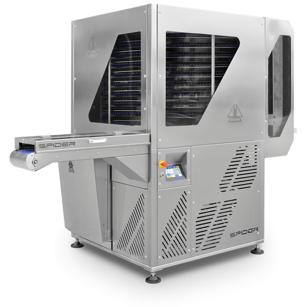 Pystymallinen tehokas jäähdytystunneli suklaan valmistukseen. Kompakti koko ja innovatiiviset patentoidut ratkaisut mahdollistavat suuren kapasiteetin tuotannon pienemmissäkin tiloissa. Spider-jäähdytystunneliin mahtuu kerralla yli 120 muottia.